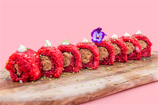 zalm, garnaal, tonijn, avocado, teriyakisaus, wasabimayonaise, mangosaus, frambozensaus, sesam